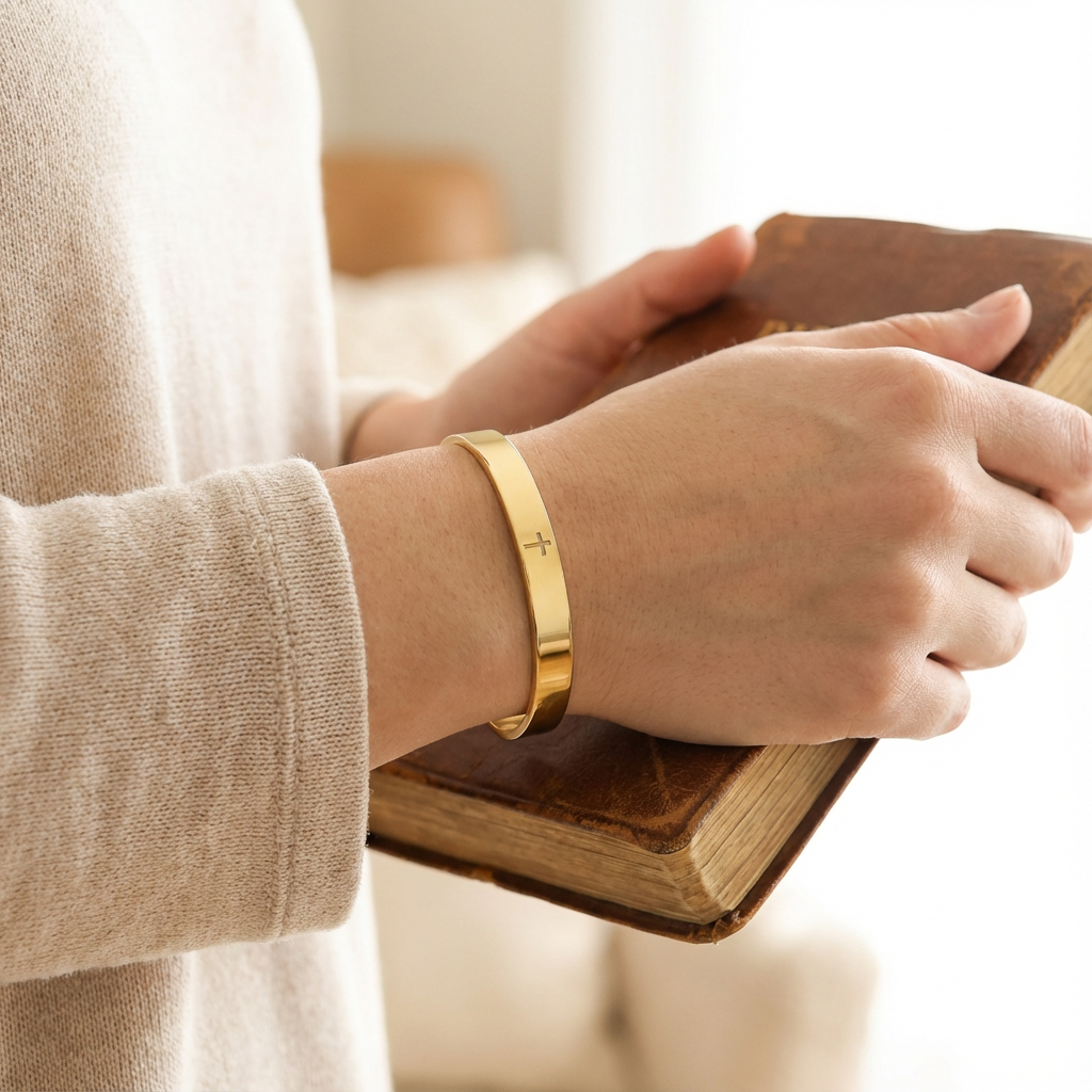 22K Gold Plated Catholic Bangle: Engraved Religious Bracelet, 1/3 inch Wide