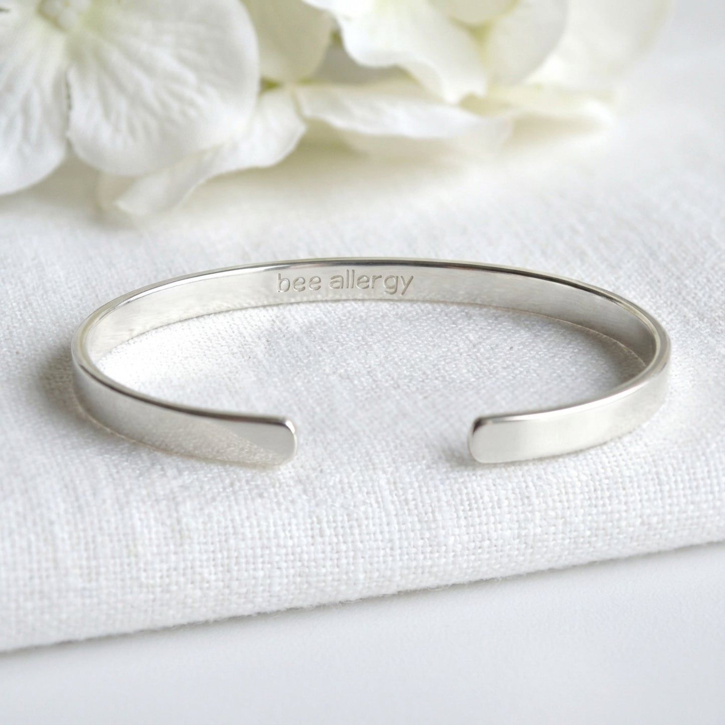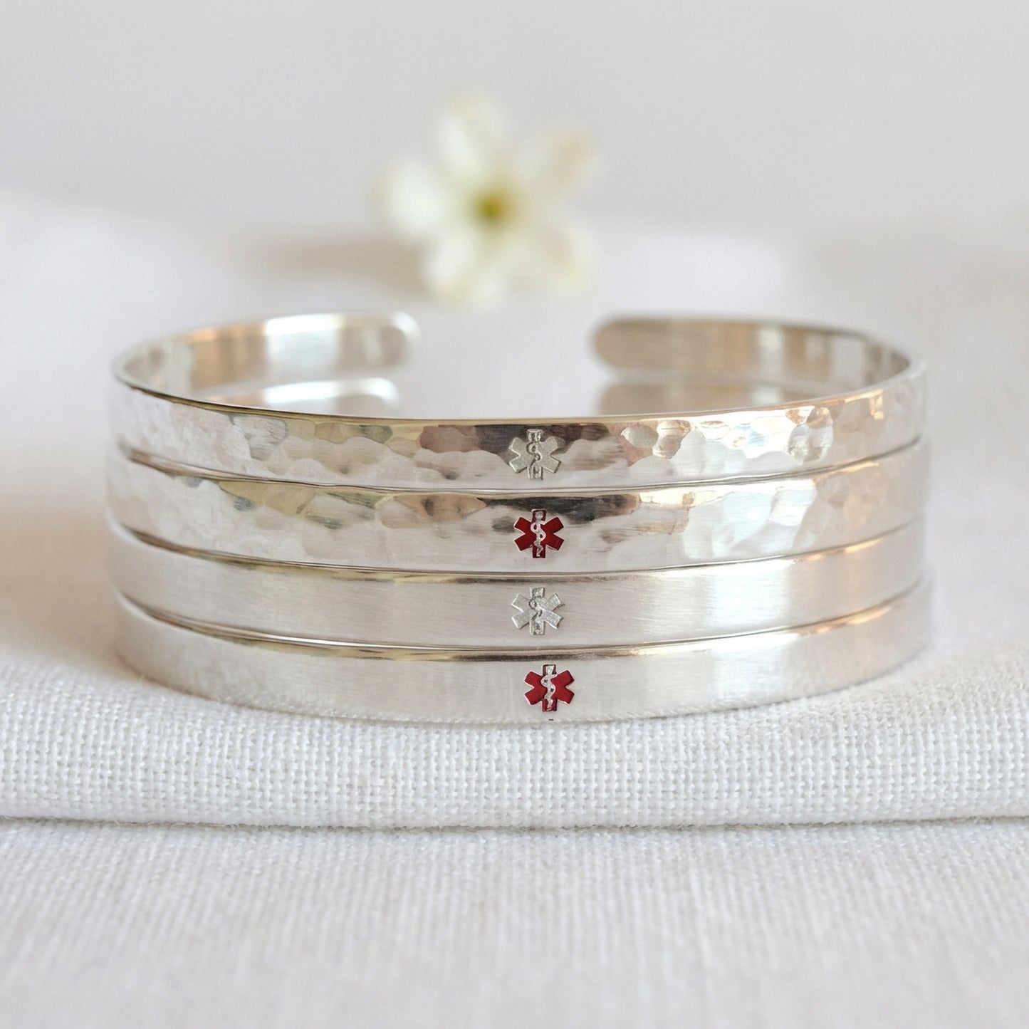 - Hammered or Smooth Sterling Silver cuff bracelet with Medical Alert Symbol outside
